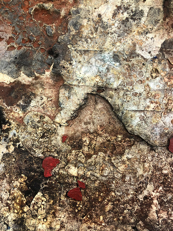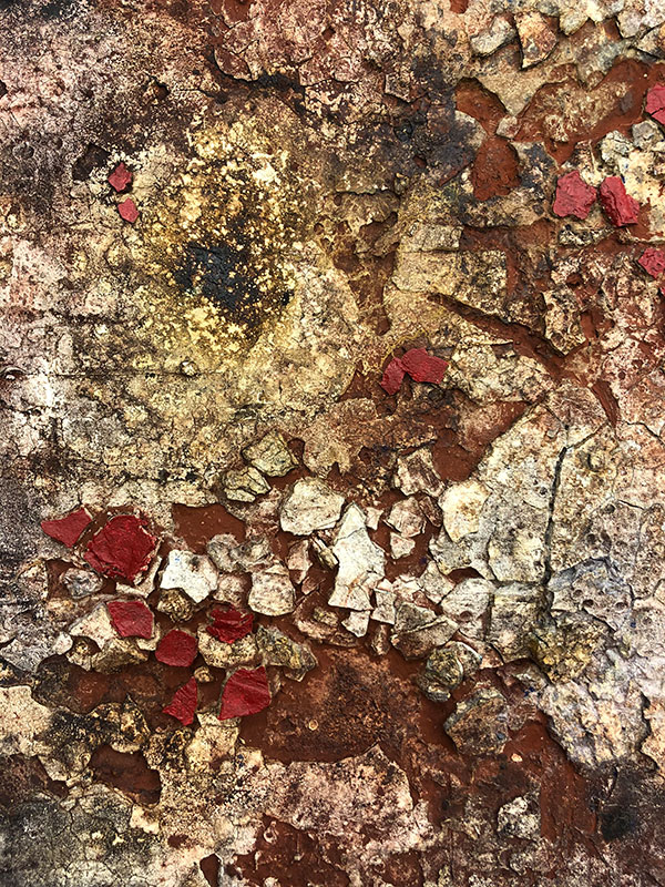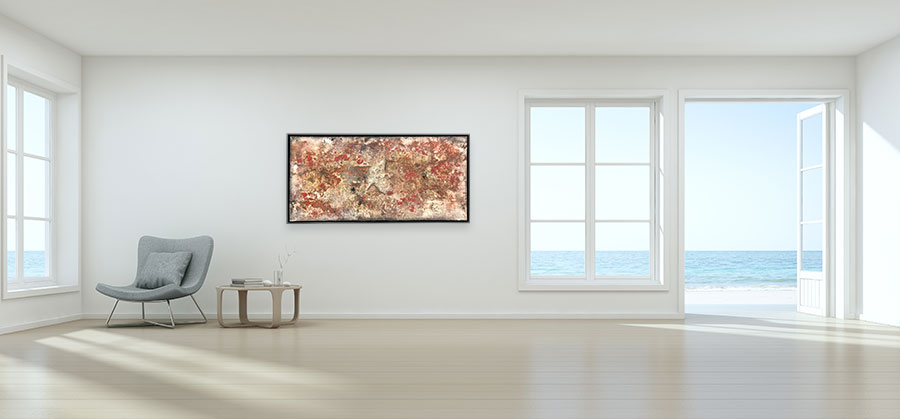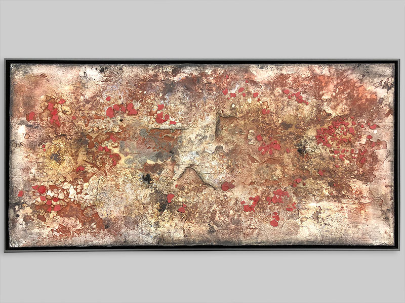 Ausführung: Marmormehl, Sumpfkalk, Tusche, Pigmente, Sand auf Leinwand im Schattenfugenrahmen.